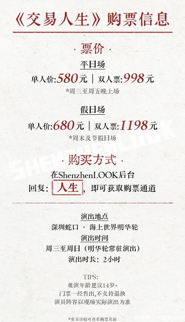 《交易人生》由英国顶级艺术家AmitLahav操刀,联同国际顶尖艺术团队、深圳本土团队为明华轮量身定制的沉浸式肢体剧。 剧本融合了深圳这座城市的DNA,观众们观演时,也将同戏中人一起探讨和思考“爱与梦想”之于我们的意义。 chapter08| 购票信息